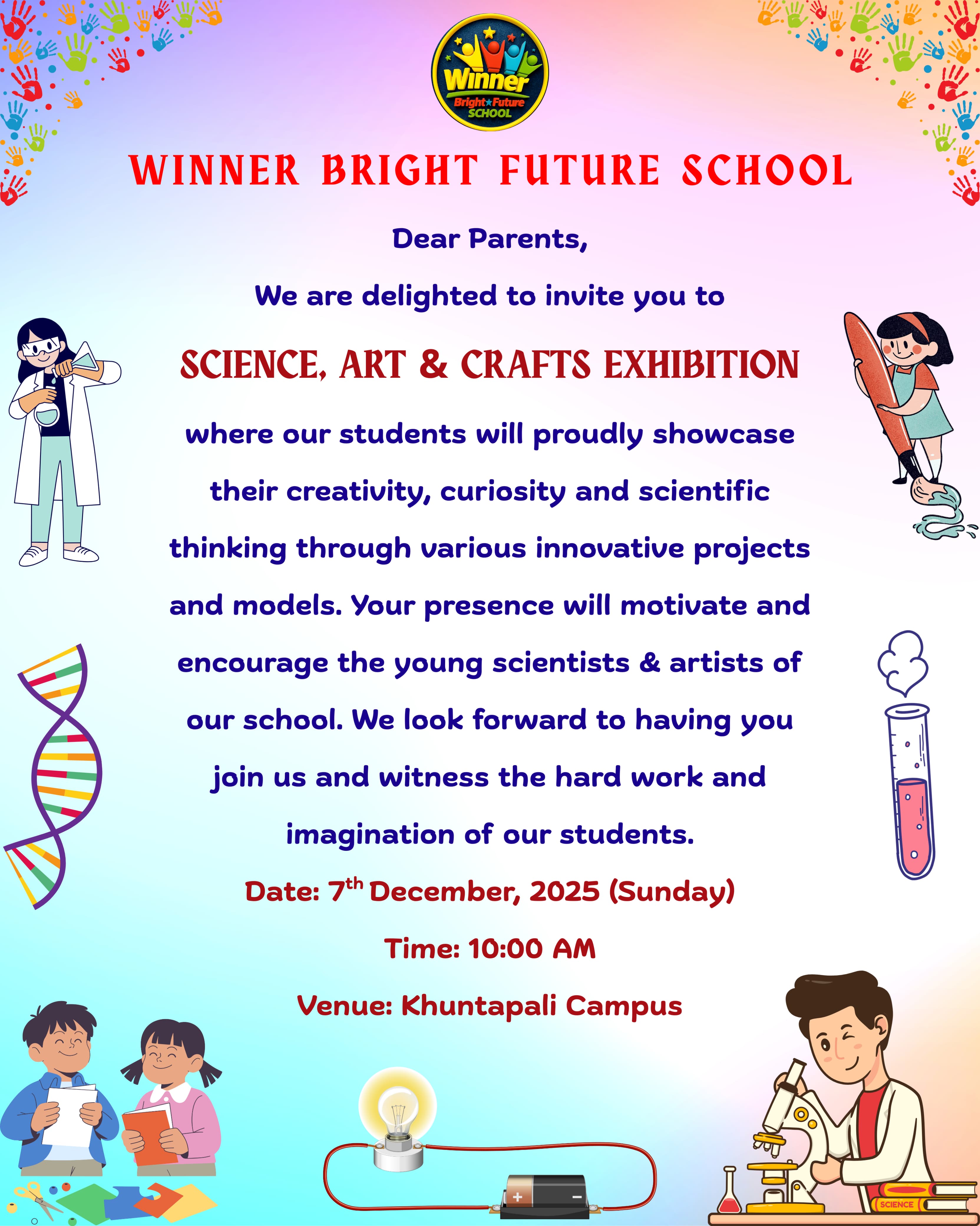 This is to inform you that Winner Bright Future School is organizing a Science, Art & Crafts Exhibition where our students will showcase their creativity, curiosity, and scientific thinking through various innovative models and projects.